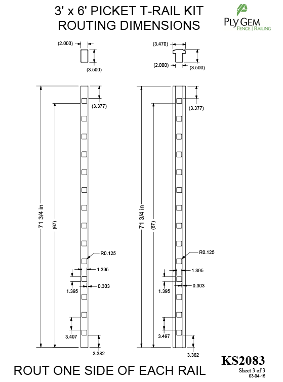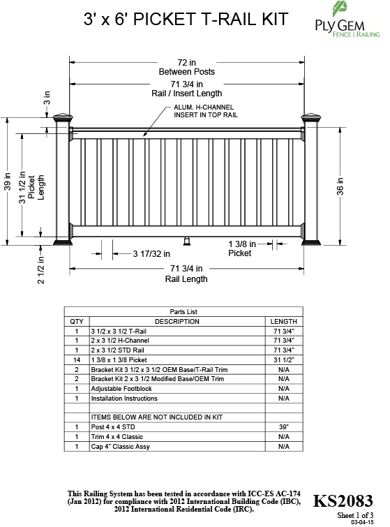 • This kit includes: (1) 3-1/2" x 3-1/2" x 71-3/4" T Rail, (1) 2" x 3-1/2" x 71-3/4" H-Channel, (1) 2"x3-1/2" x 71-3/4" Standard Rail, (18) 1-3/8" x 1-3/8" x 31-1/2" Pickets, (2) Bracket kit 3-1/2" x 3-1/2" OEM Base/T-Rail Trim, (2) Bracket Kit 2" x 3-1/2" Modified Base/OEM Trim, (1) Adjustable Footblock, and (1) Installation Instructions