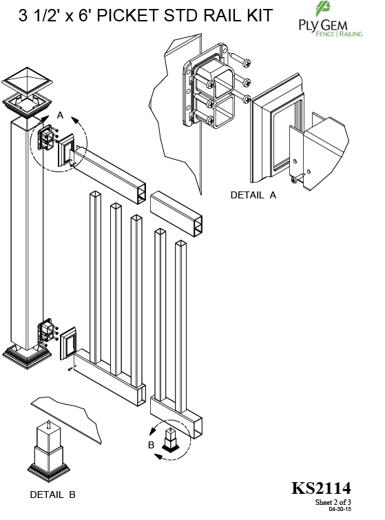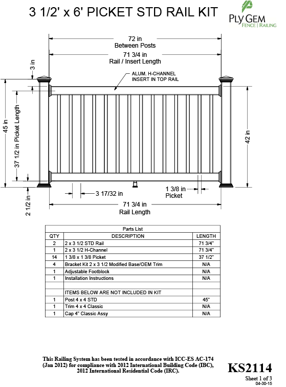 • This kit includes: (2) 2" x 3-1/2" x 71-3/4" Standard Rails, (1) 2" x 3-1/2" x 71-3/4" H-Channel, (14) 1-3/8" x 1-3/8" x 37-1/2" Pickets, (4) Bracket kits 2" x 3-1/2" Modified Base/OEM Trim, (1) Adjustable Footblock, and (1) Installation Instructions