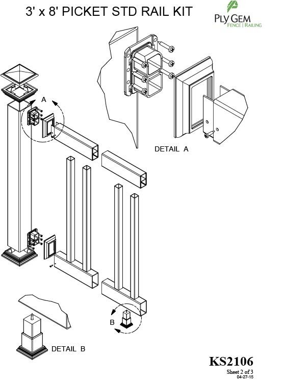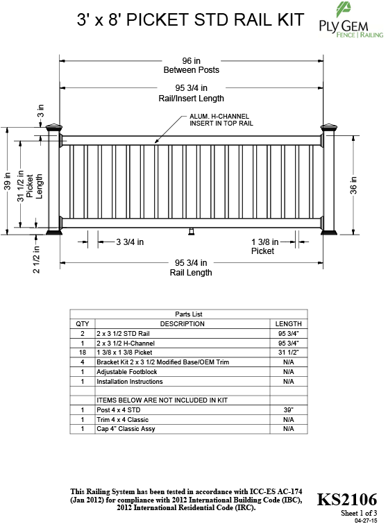 • This kit includes: (2) 2" x 3-1/2" x 95-3/4" Standard Rails, (1) 2" x 3-1/2" x 95-3/4" H-Channel, (18) 1-3/8" x 1-3/8" x 31-1/2" Pickets, (4) Bracket kits 2" x 3-1/2" Modified Base/OEM Trim, (1) Adjustable Footblock, and (1) Installation Instructions